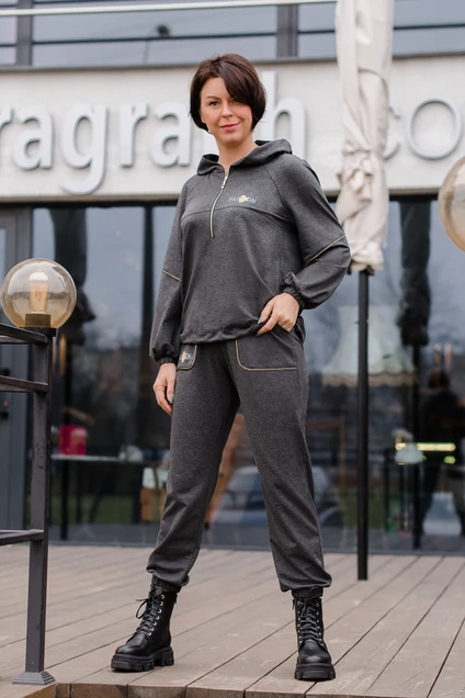 Модный женский комплект двухпредметный. Худи прямого силуэта, обьемный с длинным рукавом покроя реглан. По низу рукава притачная манжета на резинке. По центру переда частично застежка на тесьму молния и заниженная кокетка, акцентированная ассиметричной вышивкой. Низ худи присборен на кулиску из резинки с фиксаторами. По рукаву-наклонный подрез, выделенный отделочной тесьмой "цепочка" . Горловина оформлена капюшоном. Спинка без особенностей. Брюки длинныеи , снизу на резинке. По переду накладные карманы, выделенные по контуру отделочной тесьмой "цепочка" и украшенные ассиметричной вышивкой. Пояс притачной с резинкой по кругу.. Длина свитшота -66 см, длина брюк-100 см.