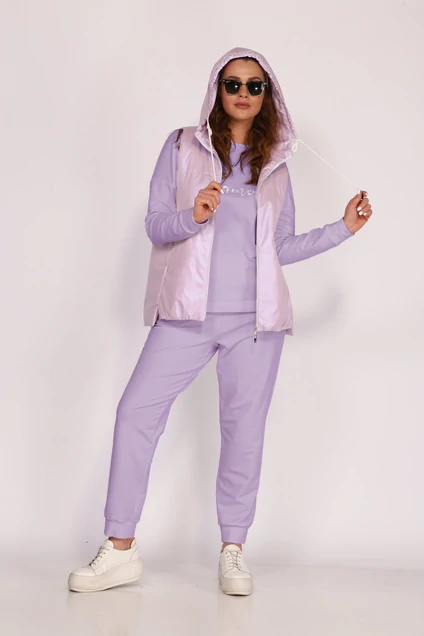 Комплект женский, 3-предметный, состоящий из жилета, свитшота и брюк. Жилет из плащевой ткани на синтепоне. По переду рельефы. В рельефах карманы. Вход а карман оформлен потайной молнией. Застежка спереди, центральная, на молнию. Горловина оформлена капюшоном с кулисой. Низ жилета разноуровневый (по спинке длиннее), чуть присборен. Снизу по рельефам небольшие разрезы!. Спинка задекорирована дизайнерской вышивкой — птица «колибри». Жилет на подкладке. Свитшот прямого силуэта. По переду и спинке рельефы. Низ разного уровня, с притачными планками по бокам. Перед задекорирован вышивкой шнуром с пайетками. Рукав длинный, со спущенной линией плеча, снизу на манжете. Горловина круглой формы с притачной бейкой. Брюки прямые, снизу на манжете. По переду наклонные карманы. Пояс притачной с резинкой по кругу. Состав: жилет: плащевка на синтепоне-100% полиэстер. Свитшот, брюки: трикотажное полотно-вискоза 60%, полиэстер 37%, лайкра 3%.