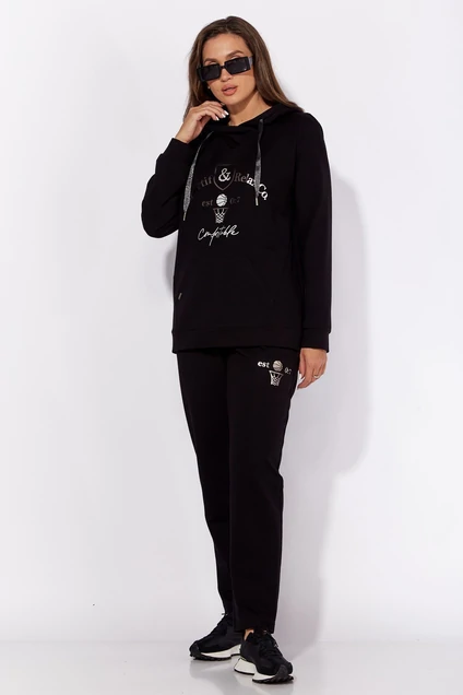 Комплект женский, 2х предметный, состоящий из свитшота и брюк. Свитшот прямого силуэта с длинным рукавом. Рукав покроя реглан с притачной манжетой по низу. По переду подрезы и карман"кунгуру" По низу притачная планка. Горловина оформлена капюшоном с запахом и кулисой по краю. Перед задекорирован принтом. Брюки прямые с наклонными карманами спереди. Пояс притачной с резинкой по кругу и декоративной кулисой спереди. По переду брюк ассиметричный, не большой принт.