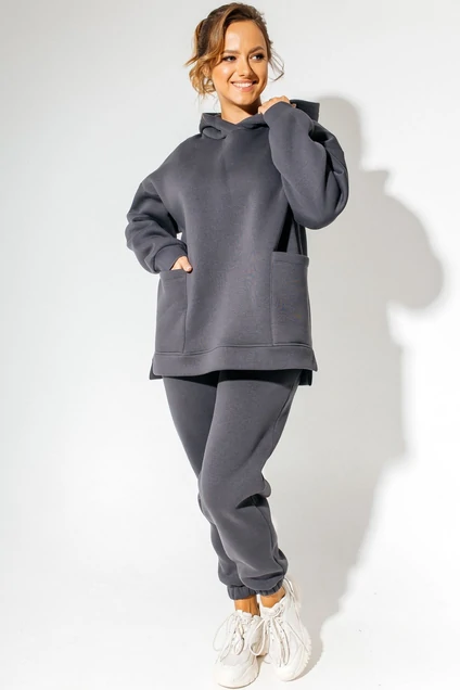 Трикотажный спортивный женский костюм оверсайз из высококачественного теплого футера состоит из худи(рукав реглан) и брюк джоггеров с высокой посадкой . Объемный двойной капюшон отлично держит форму, функциональные накладные карманы, манжеты рукавов из довяза(кашкорсе). Брюки со средней посадкой на резинке, низ на резинке с боковыми карманами. Премиальное качество.