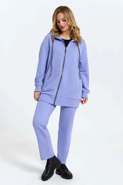 Спортивный костюм-двойка из трикотажа. Толстовка на молнии свободного покроя с капюшоном, со спущенной линией плеча, широкий притачной пояс, карманы с листочками, рукава длинные с притачными манжетами. Комфортные брюки прямого покроя. Высокая посадка, пояс притачной на резинке, регулируется шнуром. Вверху боковые наклонные карманы.