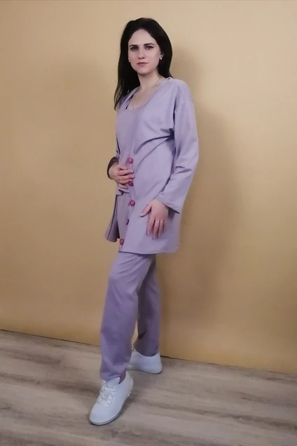 Спортивная одежда давно вышла за пределы спортивного зала и успешно закрепилась в повседневной жизни. Предлагаем вам спортивный костюм из трех изделей: топ, брюки, кардиган. Топ полуприталенного силуэта, с квадратным вырезом по спинке и по переду. Широкие бретели дополняют спортивный стиль. Трикотажные брюки свободного силуэта, зауженные к низу пояс на резинке. По боковым швам лампасы, в тон основного изделия. На уровне бедер карманы. Кардиган до середины бедра, широкая пройма не сковывает движений, Кардиган застегивается на пуговицы. Длина брюк по боковому шву - 106 см, длина топа от плеча - 58см, длина кардигана от плеча - 85 см., длина рукова от плеча - 65 см.
