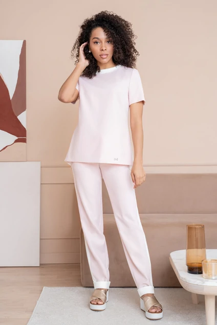 Длина блузона по спинке до горловины - 66 см, Длина рукава - 22 см, Длина брюк по боковому шву от шва притачивания пояса - 97 см, Длина брюк по боковому шву с поясом - 101 см.
