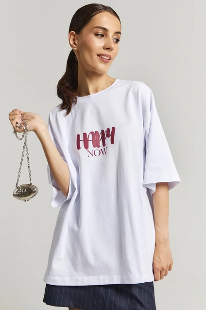 Овальная горловина, рукав свободного кроя спущен, по передней части надпись HAPPY NOW Свободный крой позволяет носить футболку как заправленной, так и навыпуск, создавая различные стилистические образы. Модель в едином размере.