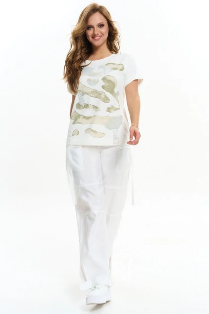 Футболка из хлопкового футера свободного силуэта, с коротким рукавом и круглой горловиной. Перед изделия декорирован авторским принтом и нашивками.