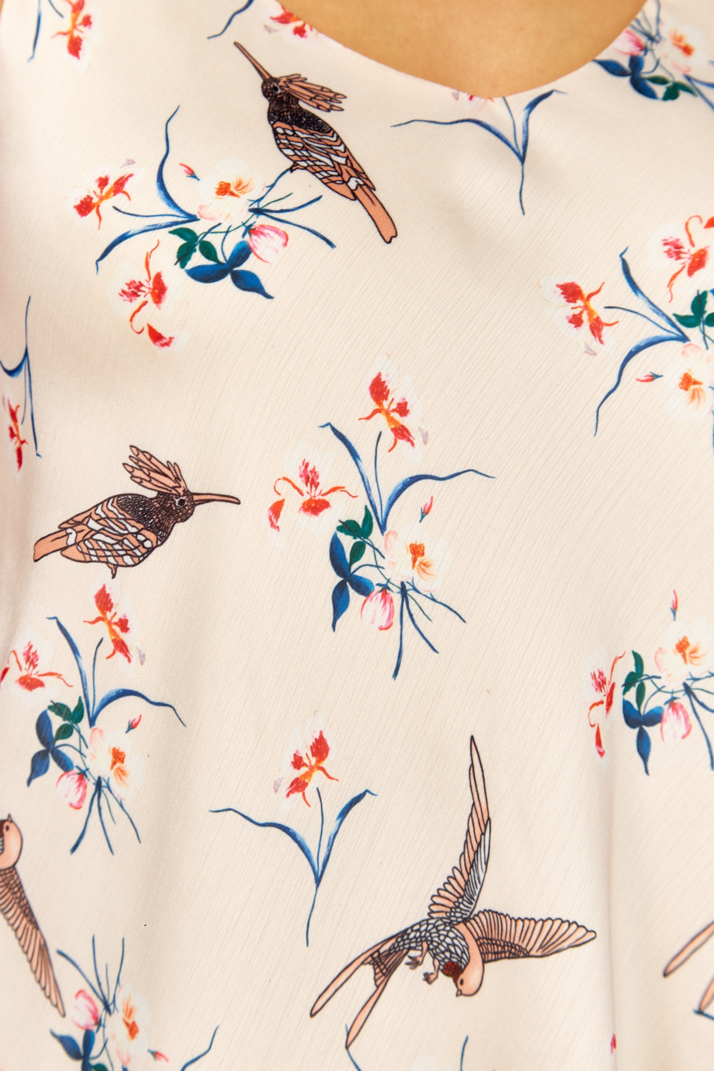 Топ на бретелях полуприлегающего силуэта. Топ двойной верх выполнен из ткани с дизайном, низ однотон. Перед покроен по косой. Бретели регулируются. Длина по боковому-45см.Параметры модели: обхват груди-98см, обхват бедер-110см, размер топа на модели 50.