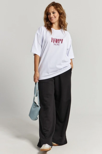 Овальная горловина, рукав свободного кроя спущен, по передней части надпись HAPPY NOW Свободный крой позволяет носить футболку как заправленной, так и навыпуск, создавая различные стилистические образы. Модель в едином размере (one size).