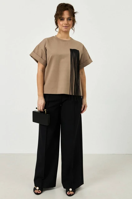 Джемпер из трикотажной ткани в цвете хаки. Линия плеча спущена, рукав короткий с подгибкой. По переду изделия нашита декоративная лента.