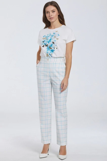 Хлопковая футболка получилась в равной степени комфортной и красивой. Спереди изделие украсили нежным принтом с мерцающими элементами. Модель с цельнокроеными короткими рукавами будет интересным вариантом как и для офиса, так и в повседневном гардеробе.