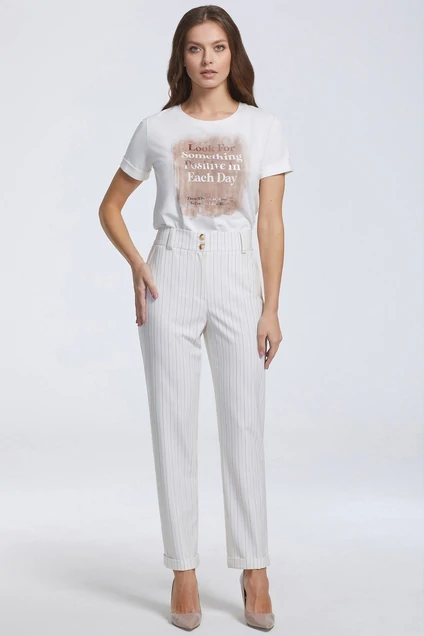 Белая удобная футболка с ярким принтом с мерцающими элементами одинаково удачно дополнит и юбку, и брючный костюм. Для пошива модели с короткими рукавами с отложными манжетами был выбран мягкий дышащий джэрси.