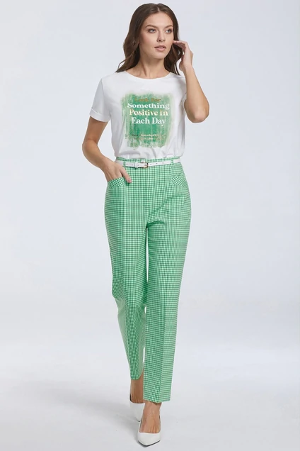 Белая удобная футболка с ярким принтом с мерцающими элементами одинаково удачно дополнит и юбку, и брючный костюм. Для пошива модели с короткими рукавами с отложными манжетами был выбран мягкий дышащий джэрси.