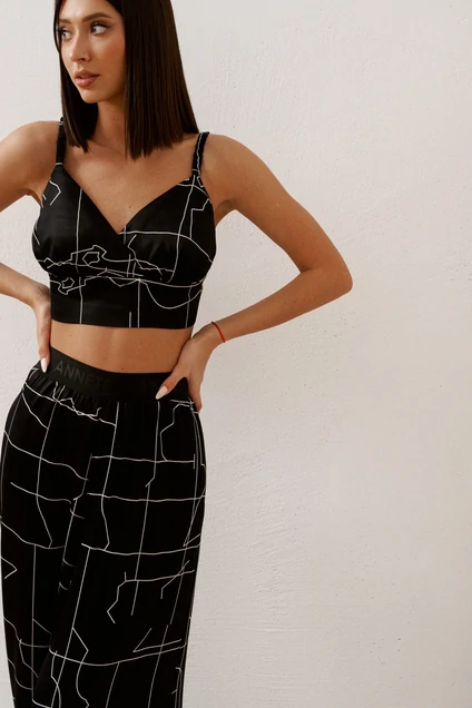 Топ на узких бретелях выполнен из вискозного полотна, черная основа с белыми абстрактными линиями. Миниатюрная но акцентная деталь Вашего образа.