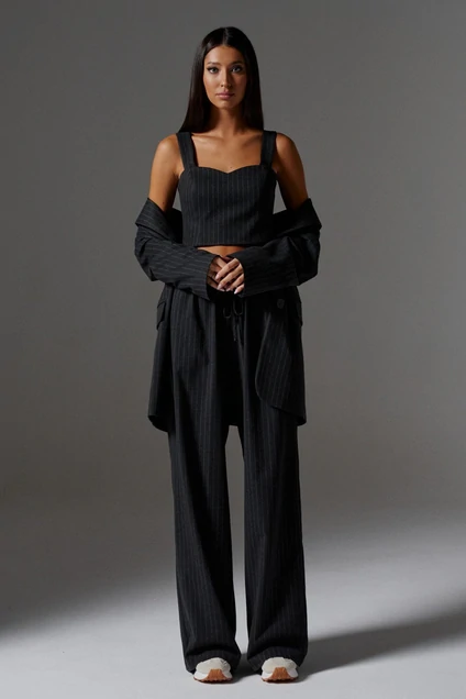 Топ на широких бретелях выполнен из плотного полотна серого оттенка в полоску. Роскошная и смелая деталь в гардеробе, позволит дополнить образ или создать новый.Характеристики: укороченный, фигурный вырез горловины, широкие бретели, по переду изделия вытачки, по спинке резинка со сборкой, застежки в изделии нет. Длина изделия 36 см.