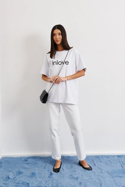 Футболка прямого свободного кроя с акцентной надписью inlove выполнена из хлопкового полотна. Характеристики: прямой свободный крой, горловина овальная, рукав слегка спущен. Длина по спинке 71 см, длина рукава 22 см.