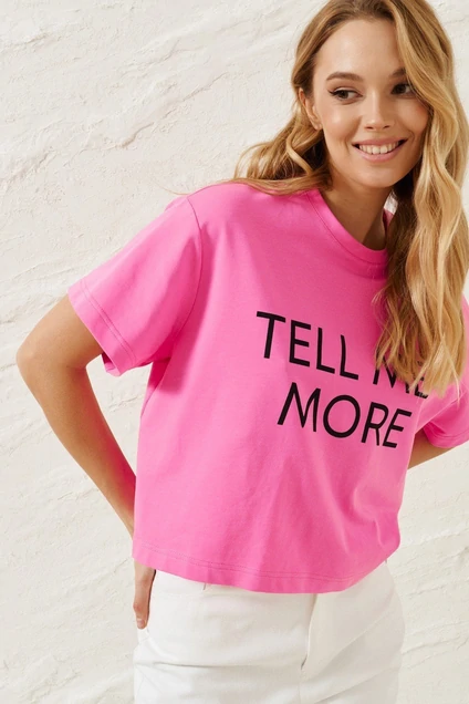 Футболка прямого свободного кроя с акцентной контрастной надписью TELL ME MORE выполнена из хлопкового розового полотна.Характеристики: прямой свободный крой, горловина овальная, рукав слегка спущен.Длина по спинке 49, длина рукава от края горловины 36 см.