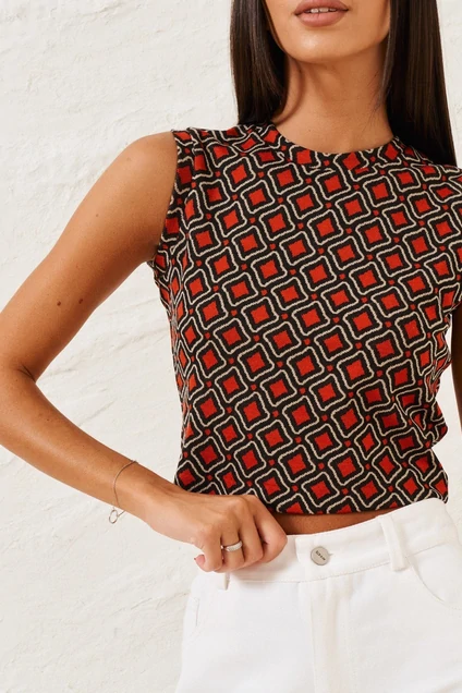 Топ прилегающего силуэта выполнен из трикотажного полотна с абстрактным принтом. Характеристики: укороченный, прилегающий силуэт, горловина стойка. Длина по спинке 40 см.