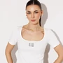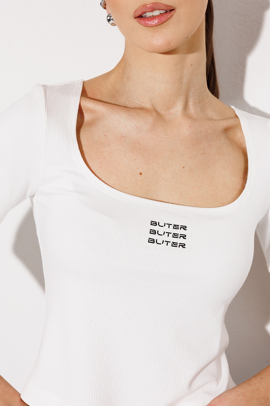 Топ трикотажный прилегающего силуэта, с втачным одношовным коротким рукавом. Полочка с печатью "BUTER" и вырезом горловины каре.
