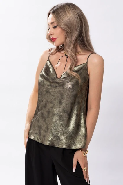 Топ на бретелях. Перед двойной, со сгибом по верху. Сгиб формируется в мягкие драпировки. Спинка с V-образным вырезом.