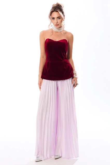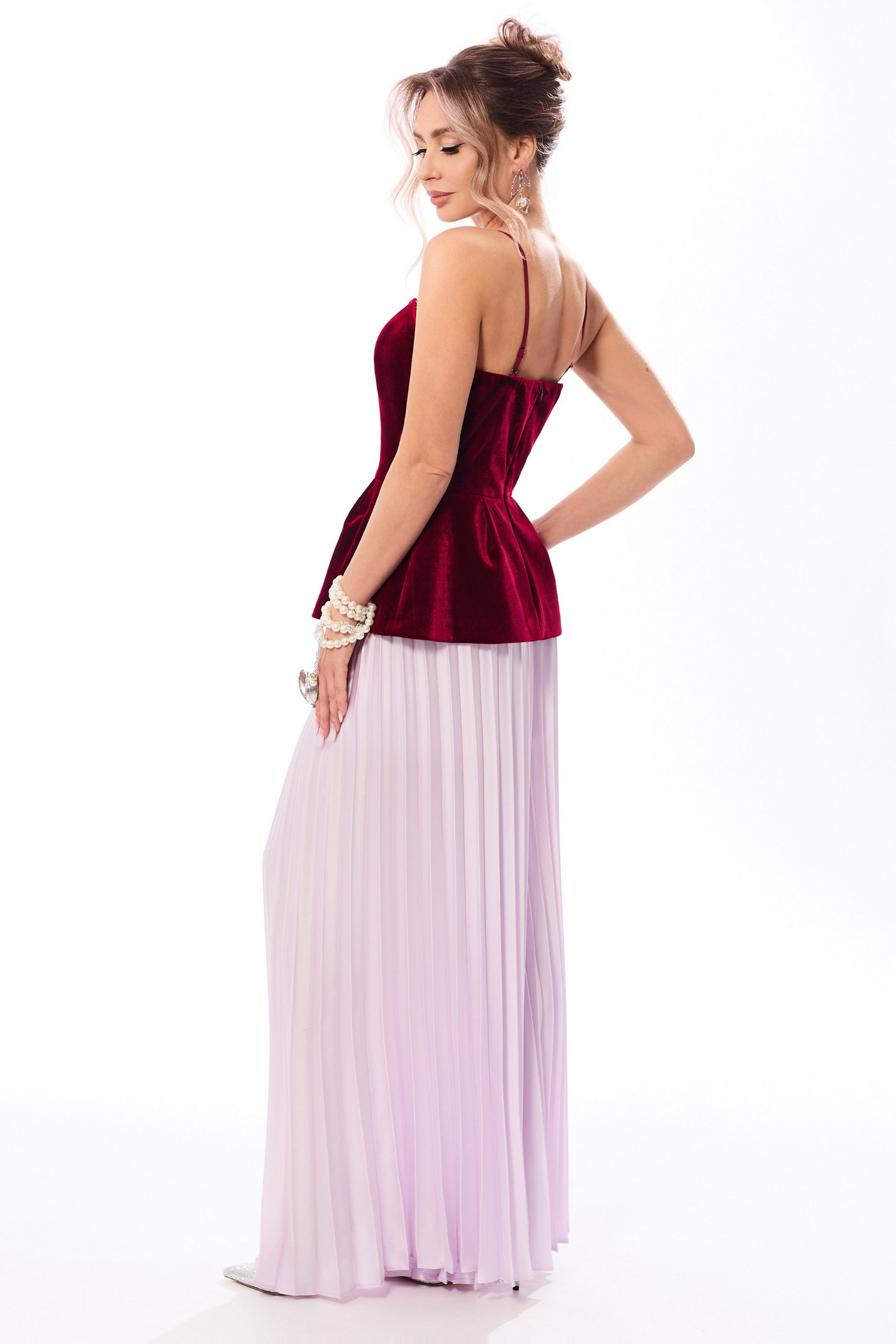 Корсет вечерний, со съемными бретелями, отрезной по линии талии Лиф переда и спинки с рельефными швами, усиленными регилином. Нижняя часть корсета с двумя встречными складками по переду и спинке. Силуэт: полуприлегающий Цветовая гамма для верха, подкладки, фурнитуры, отделки: корсет из ткани в одной цветовой гамме. Тип ткани: трикотажный, костюмно – плательный. Комплектация: корсет на подкладке.