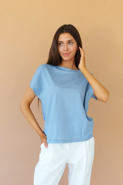 Футболка женская свободного кроя, спущенная линия плеча, вырез горловины идет лодочкой, приятная к телу, подойдет ко всем типам фигур. Легко сочетается с различными видами одежды, что позволяет создавать множество различных образов на каждый день.