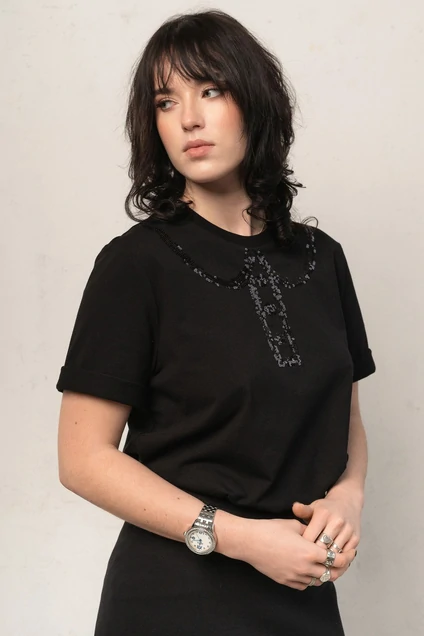 Джемпер(футболка) из трикотажа прямого силуэта с рукавом рубашечного типа.По переду декоративная вышивка пайетками черного цвета -имитация воротника с планкой и пуговицами. Длина 67см