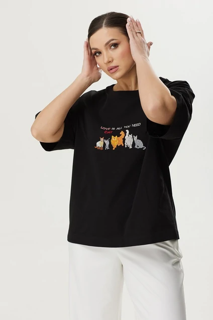 Джемпер женский из трикотажного полотна, прямого силуэта. Перед декорирован авторской вышивкой. Плечо спущено. Рукав притачной, одношовный. Горловина округлой формы, обработана обтачкой из кашкорсе. Декоративные элементы и фурнитура могут отличаться от заявленных на фото. Длина изделия от плеча 66 см, длина рукава от горловины 43 см.