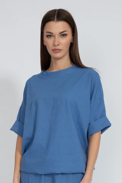 Футболка свободного кроя. С приспущенным рукавом и кулиской по низу изделия с возможностью регулировки ширины низа. Ткань лен. Отлично сочетается с брюками модели 4076 и шортами модели 4074. Рост 170