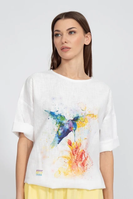 Футболка свободного кроя. С приспущенным рукавом и кулиской по низу изделия с возможностью регулировки ширины низа. Ткань лен. Отлично сочетается с брюками модели 4076 и шортами модели 4074. Рост 170