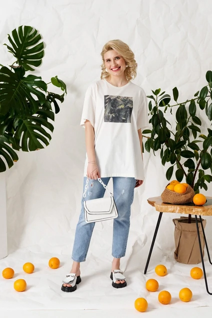 Крой футболки свободный, оверсайз. Вырез горловины круглый. Рукав до локтя. Линия плеча спущенная.