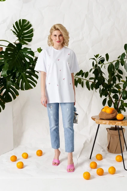 По переду выполнена вышивка в виде “полевых ярких цветочков”. Футболка универсальная, сочетается с любыми джинсами и шортами из вашего гардероба.