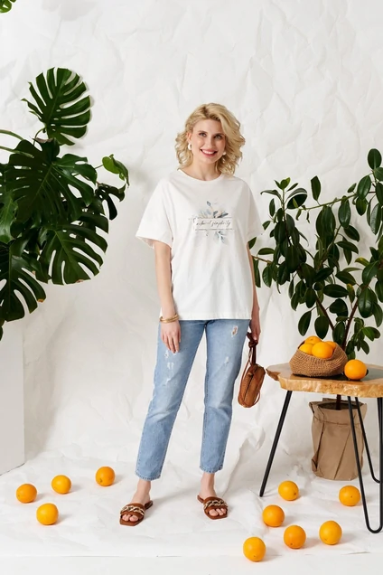 Базовая женская блузка-футболка. По переду выполнена печать в виде “акварельных листьев с золотой рамкой и надписью - natural simplicity”