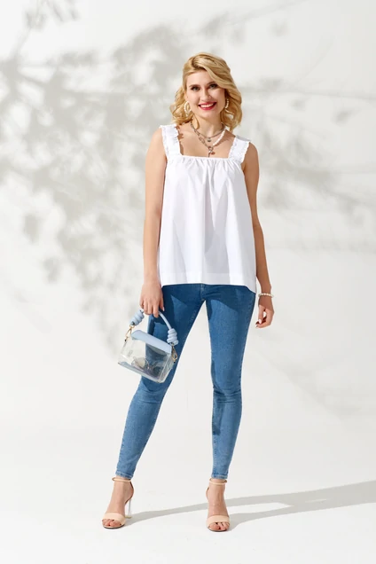 Блузка прямого свободного силуэта. Акцент сделан на широкие бретели со сборкой. По спинке вставлена резинка для удобства носки.