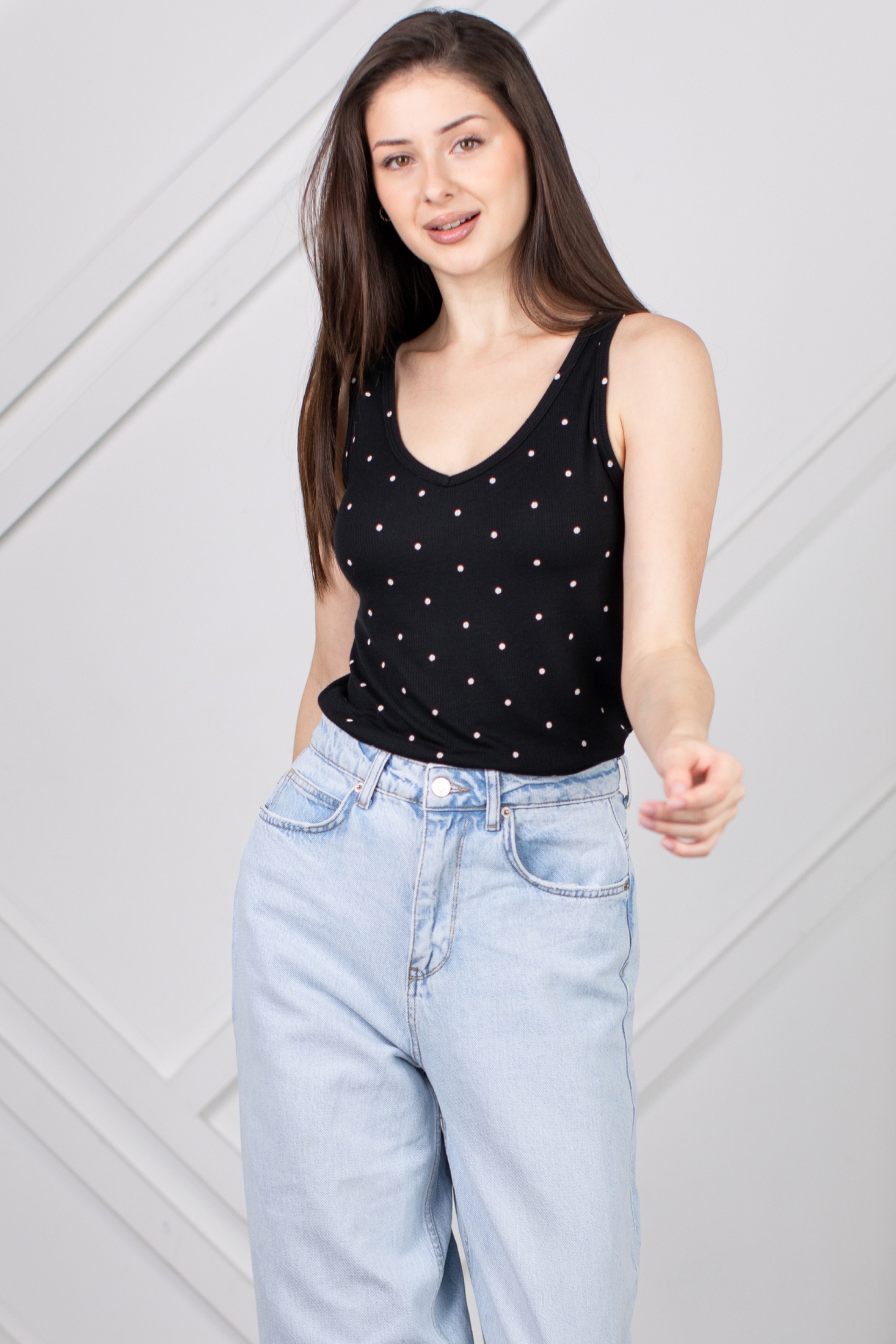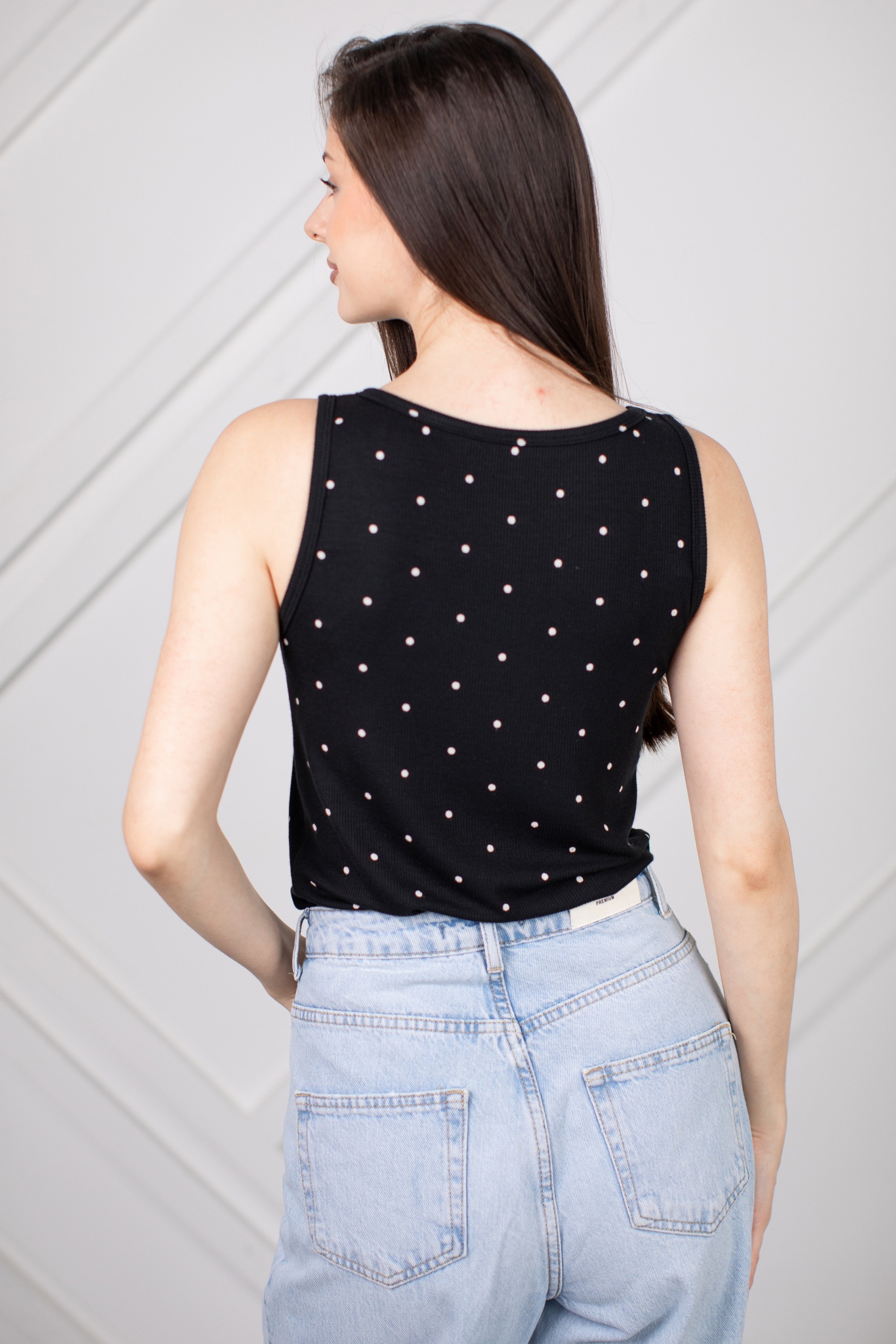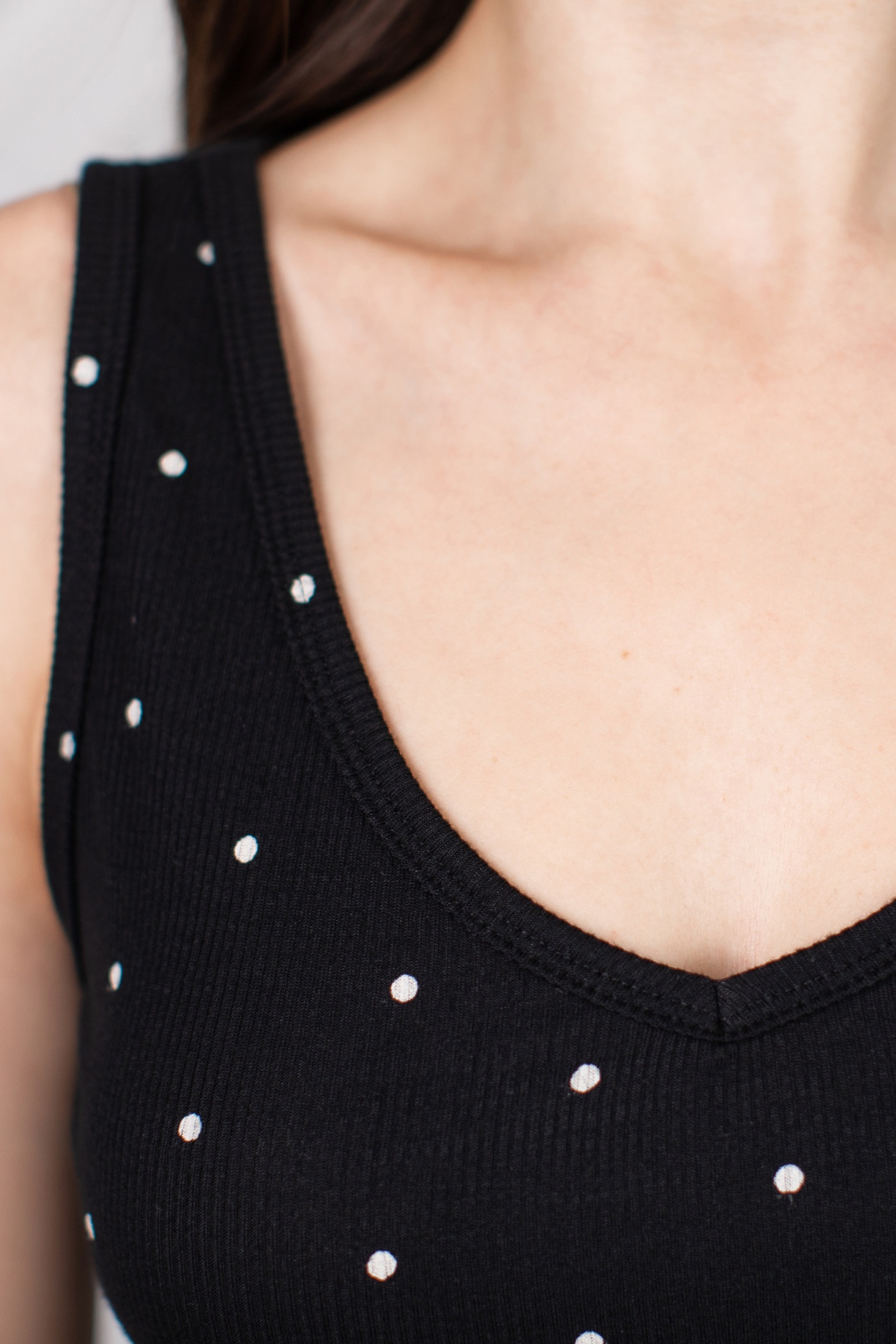 Топ без рукавов черного цвета с белыми точками, выполнен из мягкого дышащего материала. Дизайн включает классический круглый вырез и небольшой изгиб по нижнему краю, обеспечивающий отличную посадку. Идеален для создания повседневного или вечернего образа.