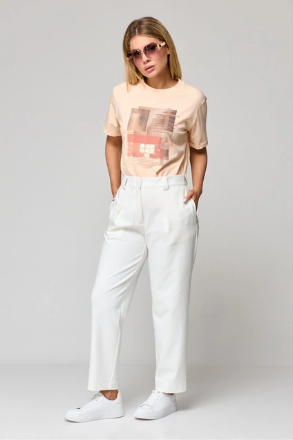 Джемпер женский, свободного силуэта, длиной до линии бедер, с втачными рукавами. На детали переда джемпера по центру нанесена декоративная печать, вырез горловины округлой формы, с втачной бейкой. Рукава втачные одношовные короткие. Длина спинки – 64см.