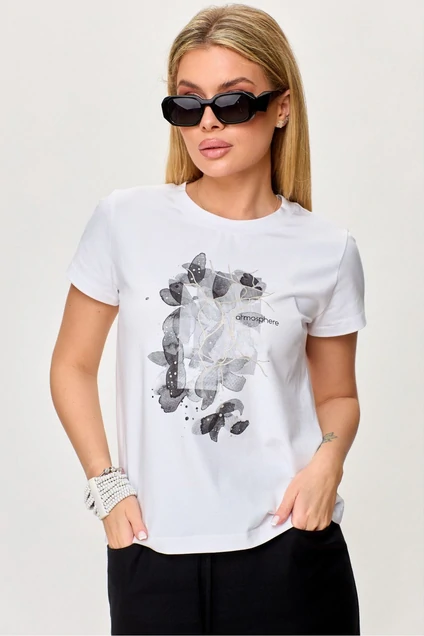 Футболка женский, свободного силуэта, длиной до линии бедер, с втачными рукавами. На детали переда по центру нанесена декоративная печать, вырез горловины округлой формы, с втачной декоративной бейкой. Рукава втачные одношовные короткие.Длина спинки – 58см.