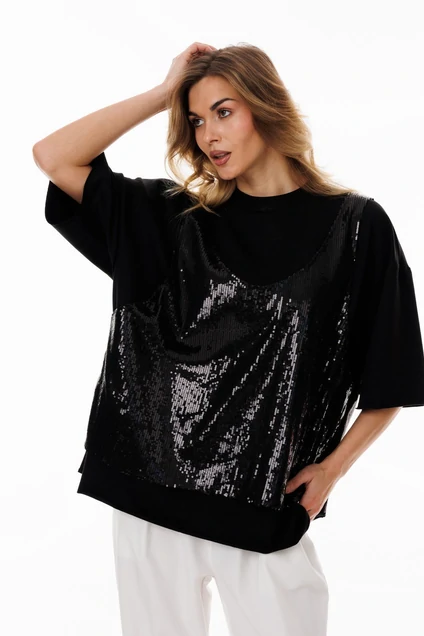 Верхние детали изделия отлетные и имитируют силуэт майки без рукавов и состоят из мерцающего трикотажного полотна с пайетками. Низ изделия и рукавов обработаны открытым срезом.
