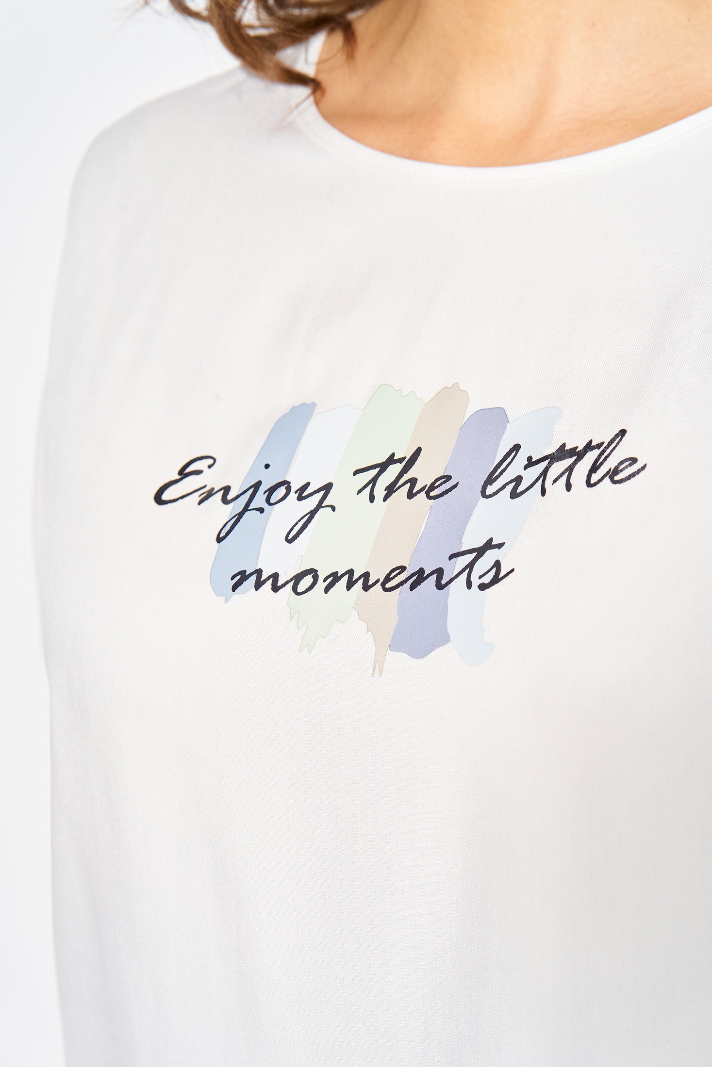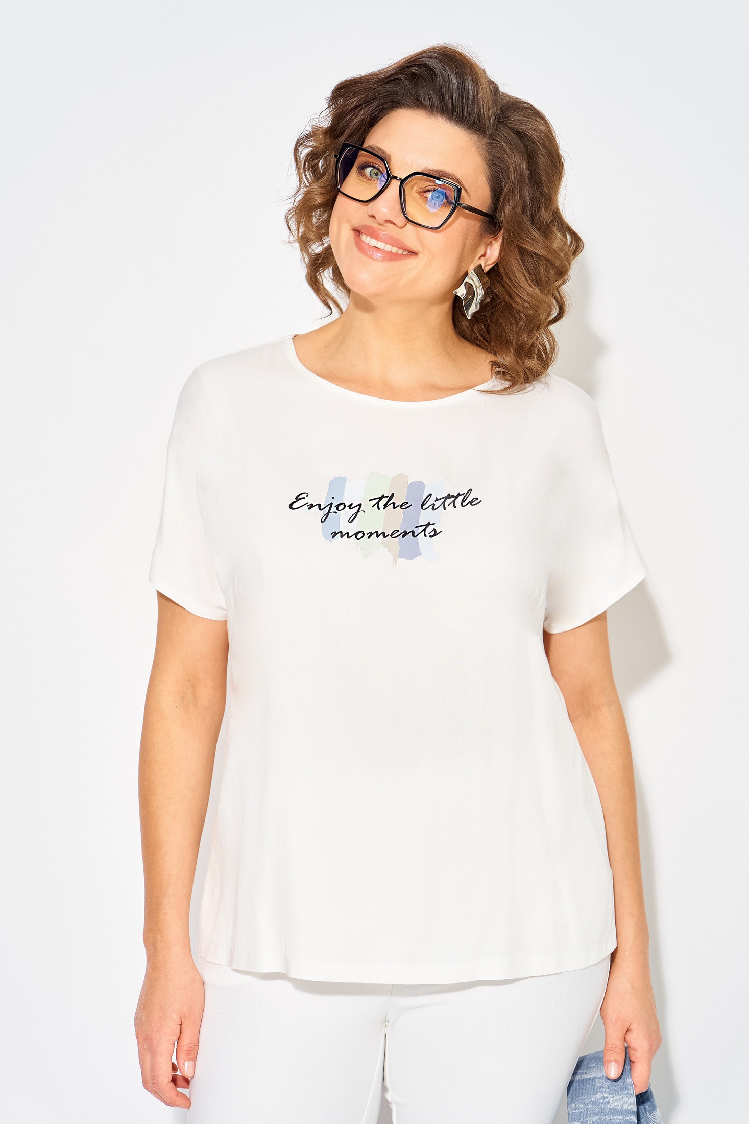 Лаконичная женская футболка, по типу топа с цельнокроеным коротким рукавом. Модель полупримталенного силуэта с нагрудными выточками и разрезами по бокам. Вырез горловины округлый, окантован. По лифу размещена термо-печать. Длина около 62 см.