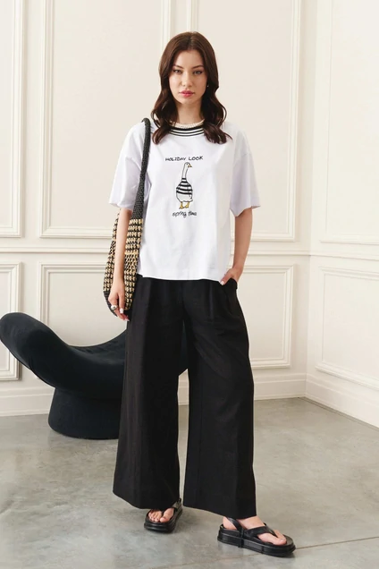 Футболка женская в стиле oversize из хлопкового трикотажа в белом цвете. Горловина округлой формы, обработана довязом. Линия плеча спущена, рукав кроткий до локтя. Спереди дизайнерская вышивка.