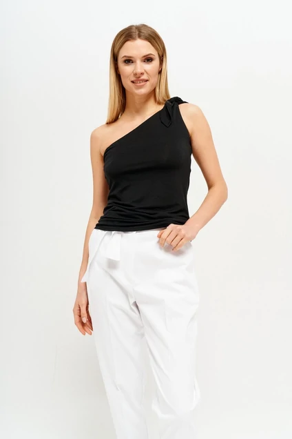 Базовый топ из трикотажного полотна, полуприлегающего силуэта на одной бретеле. Бретель завязывается декоративным узлом. Длина изделия: 55 см