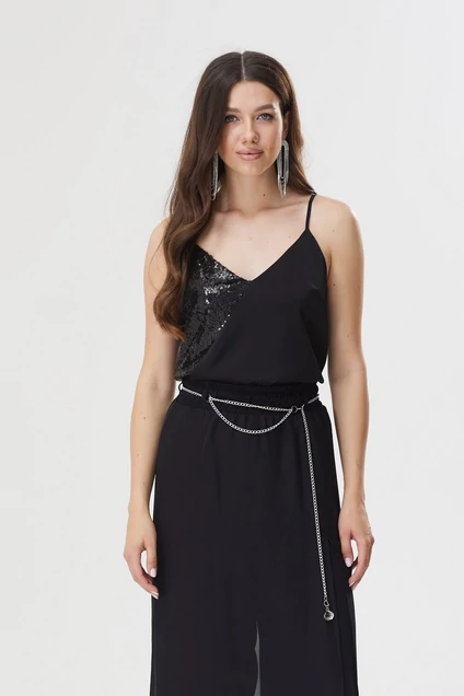 Женский топ на бретелях, полуприлегающего силуэта, с фигурным вырезом, из струящейся ткани, комбинированной тканью с пайеткой.Длина изделия: 36см+ регулируемые бретели (р50-54 – 38см )(р56-60 – 40см)