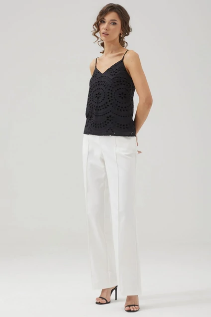 Женский топ на бретелях полуприлегающего силуэта с фигурным вырезом из ришелье. Длина топа по спинке: (42-46р – 42см+ бретель); (48-52р - 45см+ бретель)
