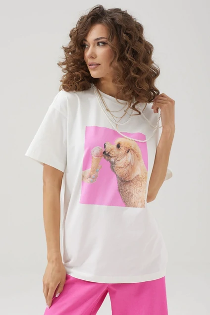 Футболка женская свободного силуэта из комфортного трикотажного полотна, длиной до линии бедер. Горловина округлая. Рукав со спущенной линией плеча длиной до локтя. По переду дизайнерская печать . Длина изделия: в 44-48р - 67см; в 50-54р - 69см; в 56-60р - 71см