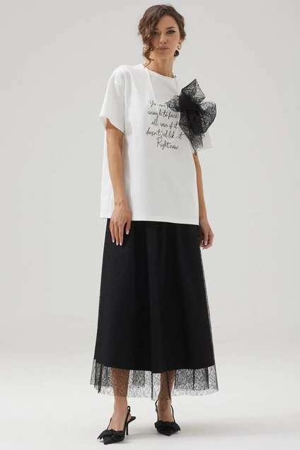 Футболка женская свободного силуэта из комфортного трикотажного полотна, длиной до линии бедер. Горловина округлая. Рукав со спущенной линией плеча длиной до локтя. По переду дизайнерская печать. В комплект входит сьемная брошь в виде банта из французского кружева. Длина изделия: в 44-48р - 67см; в 50-54р - 60см; в 56-60р - 71см