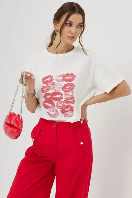 Футболка женская свободного силуэта из комфортного трикотажного полотна, длиной до линии бедер. Горловина округлая. Рукав со спущенной линией плеча длиной до локтя. По переду дизайнерская печать. Длина изделия: (44-48р -67см); ( 50-54р -69см); ( 56-60р -71см )