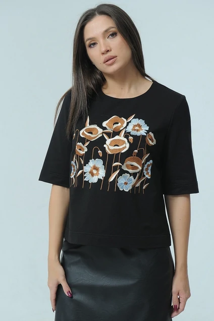Горловина округлая, обработана обтачкой. Полочка цельная с нагрудными вытачками, на груди дизайнерская вышивка "маки". Спинка со средним швом, в верхней части которого застежка на навесную петлю и пуговицу. Рукав короткий одношовный втачной.