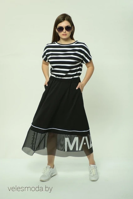 Трикотажный джемпер в модную полоску длиной до линии бедер. Рукав короткий, обработант отрезной тманжетой с отворотом. Горловина - лодочка.
