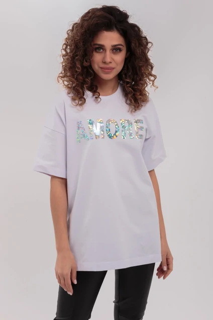 Футболка свободного силуэта oversize со спущенным рукавом и печатью (AMORE) по переду. Горловина обработана бейкой.