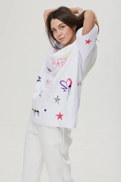 Футболка в стиле onesize свободного силуэта со спущенной линией плеча выполнена из кулирки. Вырез горловины овальной формы. Рукава втачные, одношовные. Яркие и красочные печати по всей футболке сделают Ваш день солнечным и жизнерадостным.