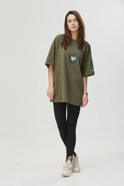 Футболка в стиле onesize свободного силуэта со спущенной линией плеча выполнена из кулирки. Вырез горловины овальной формы. Рукава втачные, одношовные. Дизайнерская печать по переду, спинке и на рукаве. Универсальная футболка на каждый день.