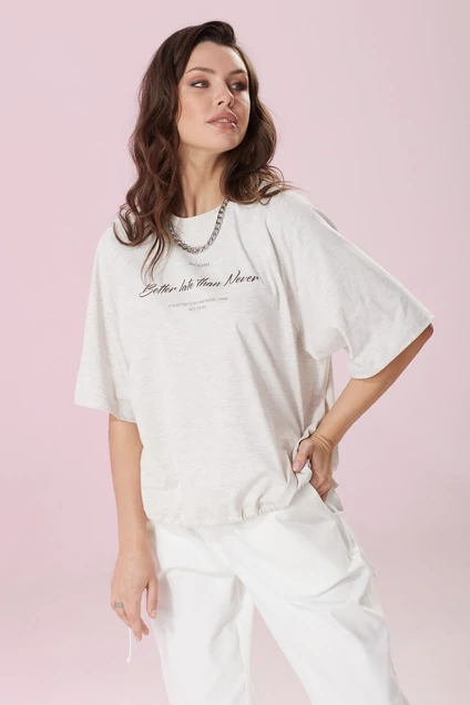 Футболка свободного силуэта, рукав реглан. Вырез горловины овальной формы, обработан притачной бейкой. Изделие с фигурным низом, перед короче спинки. Перед с кулисой и шнуром, который позволяет регулировать ширину изделия. По переду и спинке расположены печати в минималистичном стиле. Модель one size (42-52)